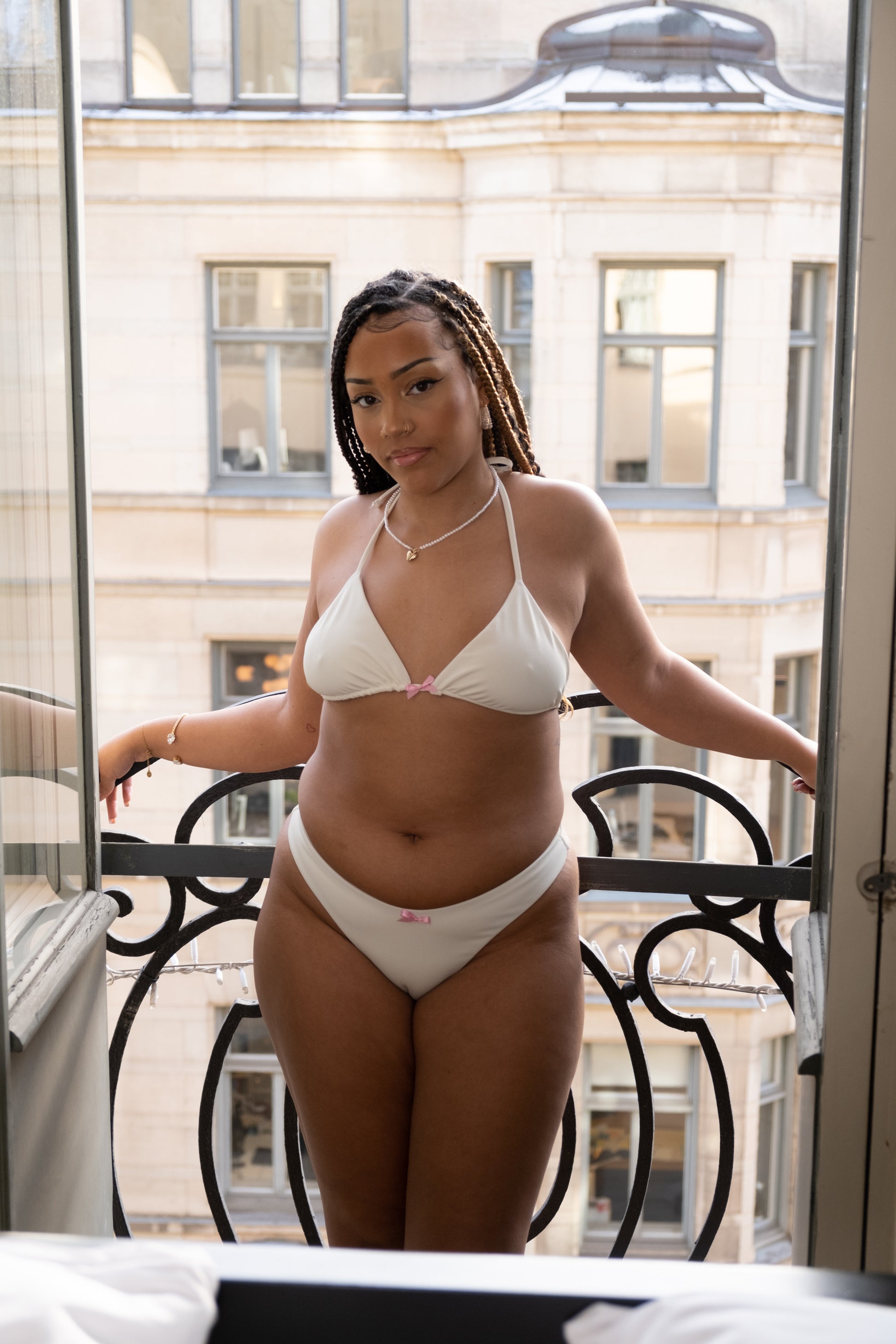 Everybody's favorites, the cheeky bottoms. Gives the bum an uplifted look. The cheeky bottoms curves in the opposite directions to the bottoms cheeks and gives a highlight to the bum's natural shape and curves. The model is wearing size M on top and L in bottoms. Please note, tops and bottoms are sold separately.