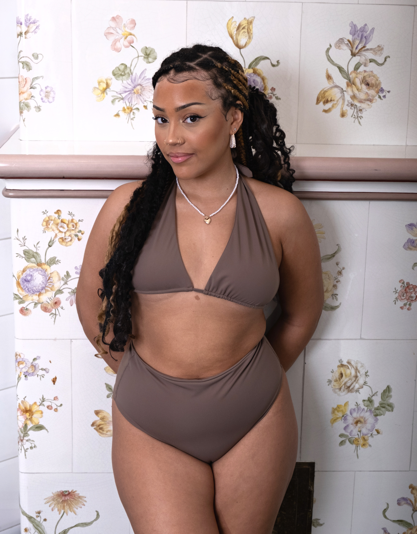 High-waisted bottoms are a style of clothing that sits at the natural waistline, often covering the belly button. The high waistline creates a flattering silhouette, gives a look of extended legs, and provides coverage for the tummy. The model is wearing size M on top and L in bottoms. Please note, tops and bottoms are sold separately.